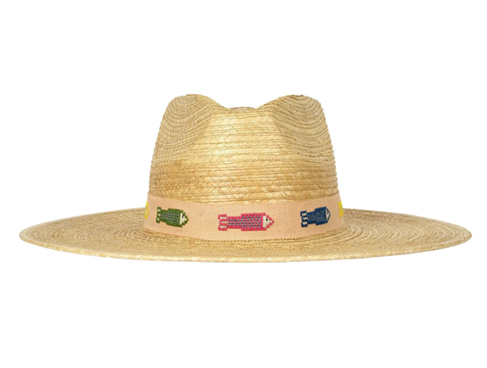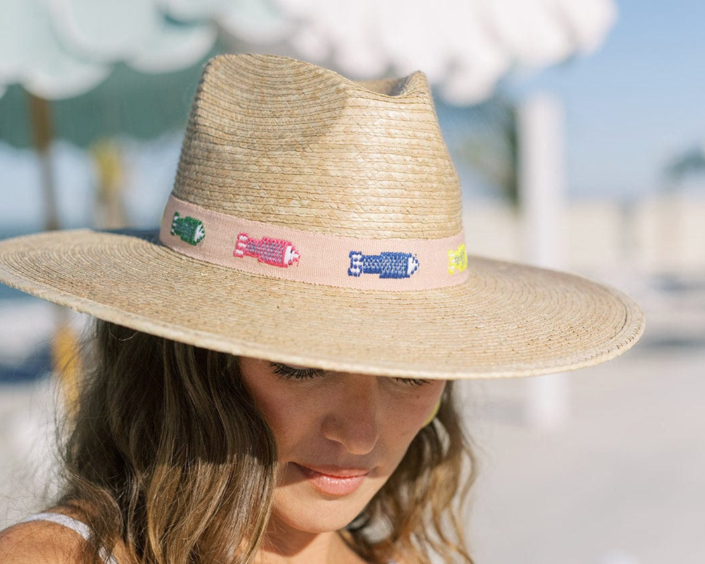 The Colorful Fin Palm Hat features a blush cotton band with assorted colorful embroidered fish and is a part of our sustainable, fair trade hat collection and graded at the highest UPF rating.