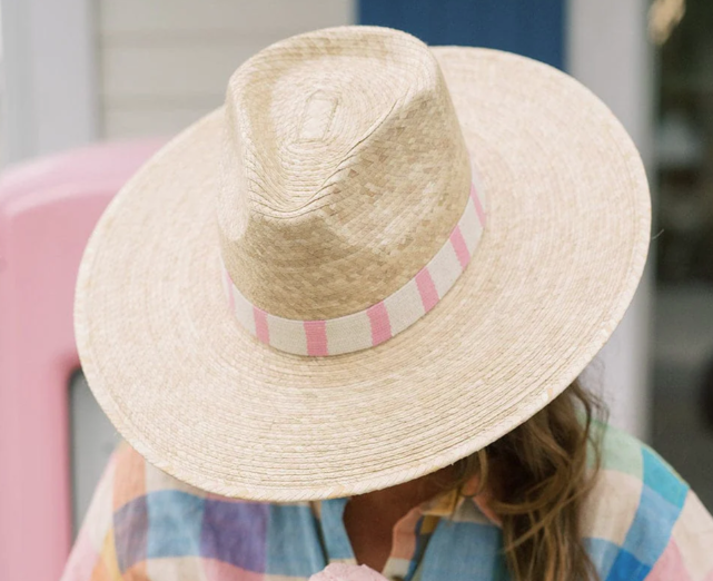 The Dulce Palm Hat features a neutral cotton band with pink stripes and is a part of our sustainable, fair trade hat collection and graded at the highest UPF rating.