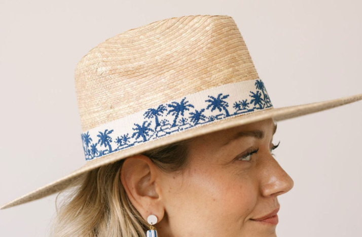 The Tropical Toile Palm Hat features a neutral cotton band with navy embroidered palm trees and is a part of our sustainable, fair trade hat collection and graded at the highest UPF rating.