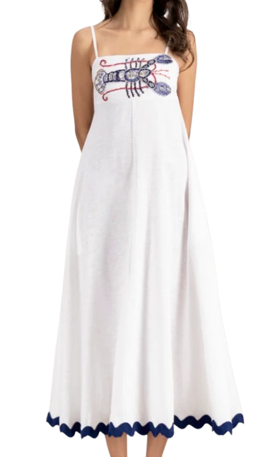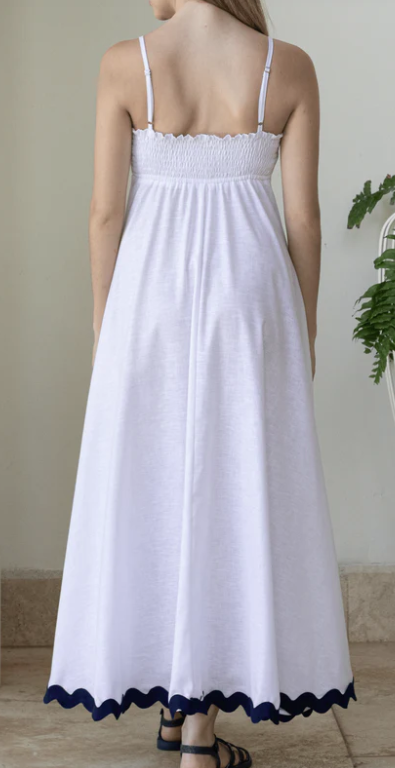 White Linen Maxi with Lobster Detail and Navy Trim