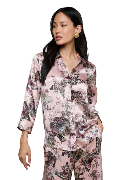 The iconic silk button-down that belongs in every wardrobe. This all-time bestseller is constructed with three-quarter length sleeves designed to perfectly showcase your jewelry—no sleeve rolling required. Our signature Dani blouse is back in light pink with a butterfly jungle print.