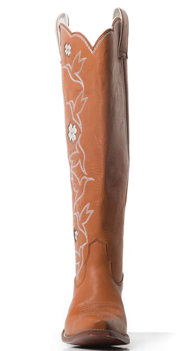 Delicate hummingbirds dance up the shaft, framed by sweet inlaid flowers and finished with a bold side seam. Featuring signature Besita scallop topline and statement heart on the heel