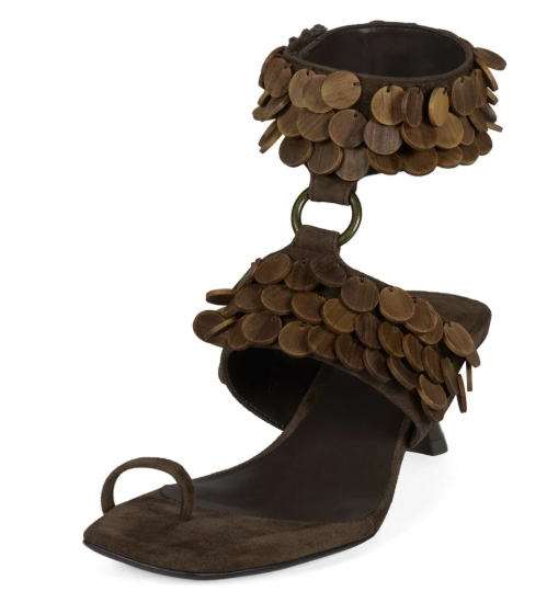 Kitten heel sandal with ornamental wooden detail and ankle strap