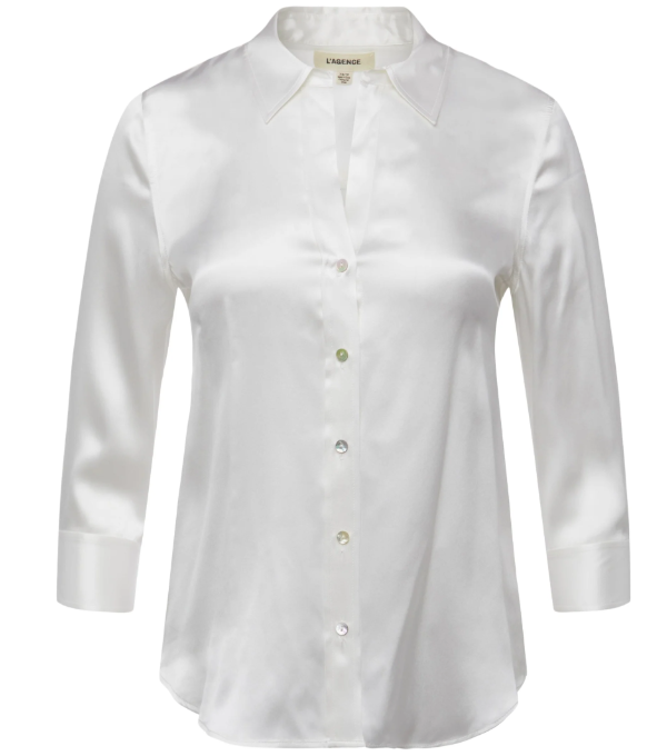 A timeless button-down blouse in lustrous silk charmeuse ivory. Featuring a high-low shirttail hem, the fresh design also has a spread collar, three-quarter cuffed sleeve, and back yoke that offer a tailored touch to this feminine look. 100% Silk.