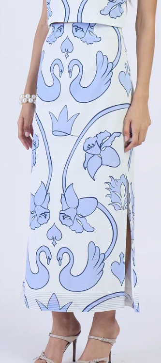 The Aspen Skirt is a sleek and sophisticated design that flatters the figure with its fitted silhouette. The slender cut creates a stream- lined look that's perfect for making a statement. The side slits provide a touch of movement and freedom, making it ideal for a night out or a busy day on the go. Aspen is crafted from a unique blend of cotton and linen, offering a soft, breathable feel and a beautifully textured finish. Channeling the quiet glamour of Monaco’s golden era, this print is designed for a modern Grace Kelly. Bold motifs of swans, crowns, and daffodils reference royal heritage and refined glamour.