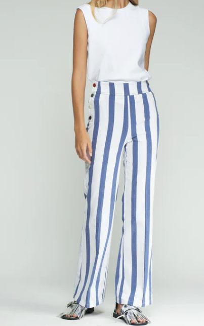 Straight-cut trousers with a vertical striped print in blue and white. Decorative buttons on both sides of the waistband.