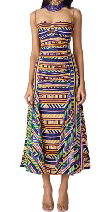 Abstract Stripe Print Dress With Fitted Bodice, Noodle Straps And Cross Cut Flare