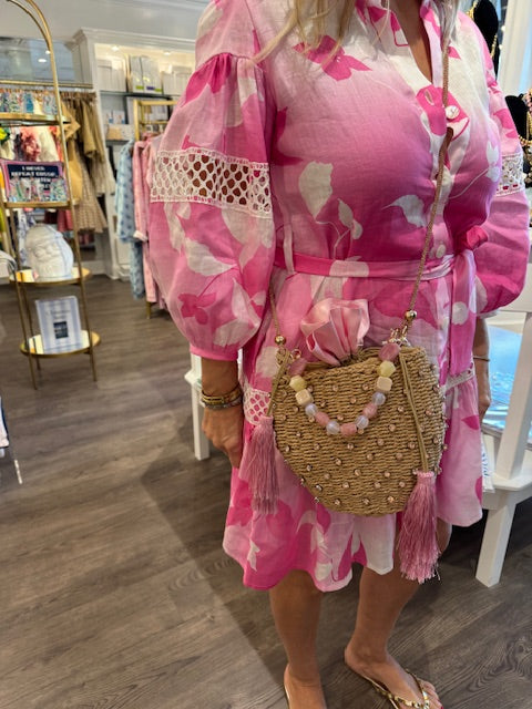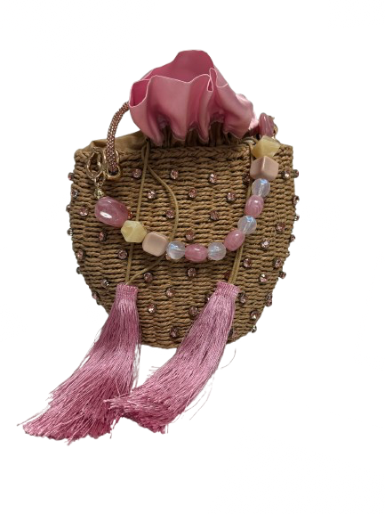 100% Straw bag with clear stud detail.  Cloth drawstring lining.