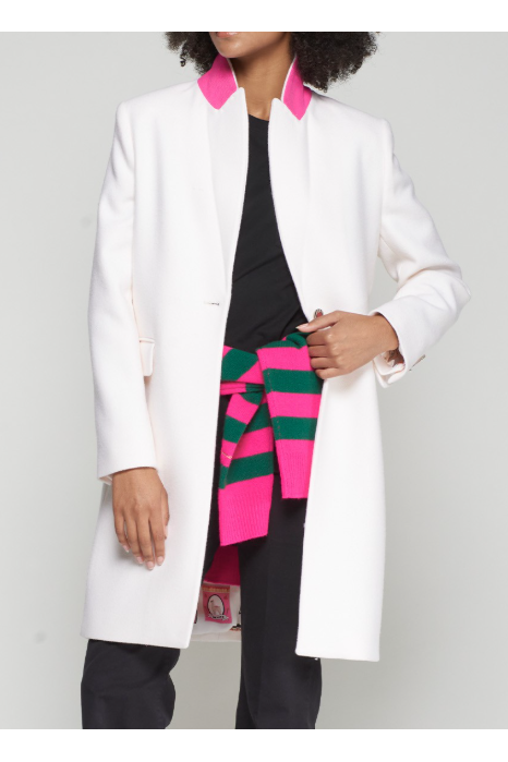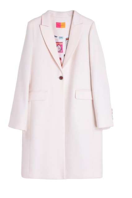 Straight-cut ivory coat made from a wool-blend fabric. It features a front closure with a decorative button printed with a red heart. Classic collar with inner contrast in fuchsia pink. Front flap pockets and full printed lining.