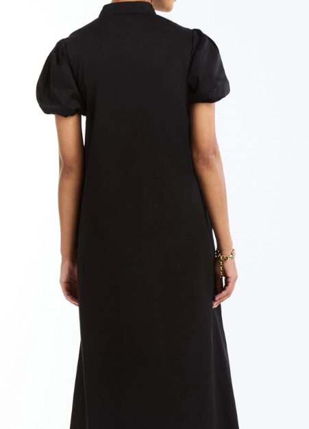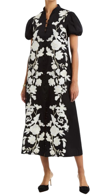 The Elliana Barong Midi Dress in Black Ivory combines heritage-inspired embroidery with a timeless silhouette. Designed with Mestiza’s signature Manton de Mantilla floral motifs along the sleeves and framing the body, this A-line midi offers romance and refinement. Finished with functional buttons at the neckline, puff sleeves, and practical side pockets, it’s a statement piece for daytime events and special occasions.