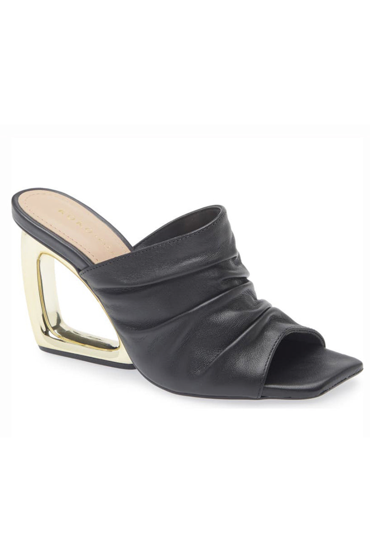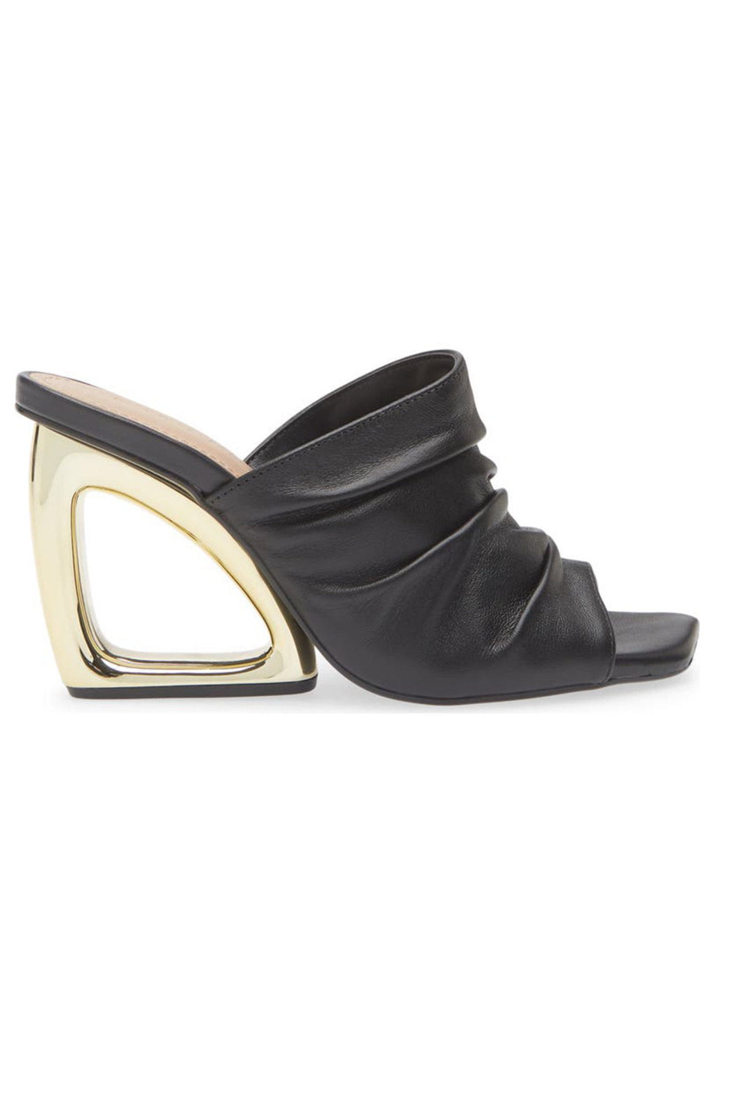 Featuring a crinkled leather upper and a 3" gold triangle heel, this slide sandal offers an open toe design and leather lining, expertly crafted in Brazil.