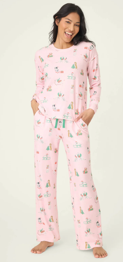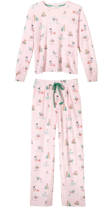 Women’s pink pajama set in baby peachy waffle with allover holiday dog print, long-sleeve crew top, and drawstring pants.