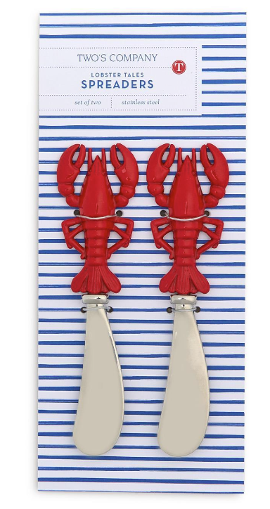 The Lobster Tales Set of 2 Spreaders brings a touch of coastal charm to your table. Featuring stainless steel blades with zinc alloy handles shaped like lobsters, these spreaders are perfect for soft cheeses, butter, or dips. Presented on a decorative gift card, they make a delightful hostess or housewarming gift.