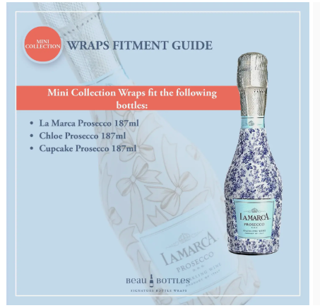 Enhance your mini LaMarca Prosecco bottles with our exclusive wraps, designed to add a touch of sophistication to your celebrations. Crafted for the 187 mL LaMarca Prosecco bottles, these wraps provide a seamless fit, elevating your events with ease.  Key Features:  Perfect Fit: Tailored specifically for 187 mL LaMarca Prosecco bottles, ensuring a flawless appearance.  Effortless Application: Simply position the wrap, apply heat, and watch it conform to the bottle's shape for a smooth, professional finish.  Durable & Waterproof: Engineered to endure refrigeration, ice buckets, and condensation without losing quality.