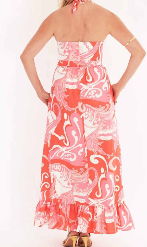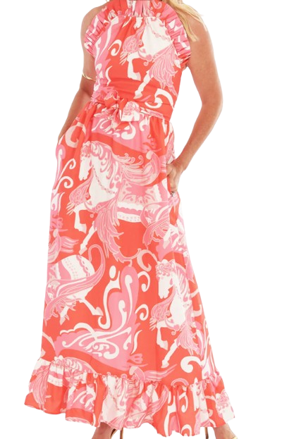 A Cult Favorite! This flattering silhouette features a feminine ruffle trimmed halter top and a ruffled hem. Just add a heel and statement earring, and you'll be ready for any special event this season!