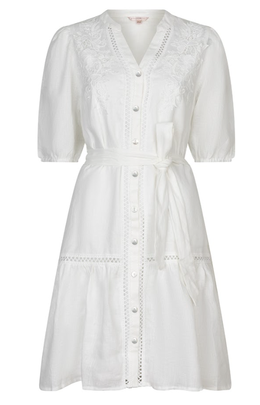 A blouse dress featuring embroidered flowers, puff sleeves, and a tie belt at the waist. The dress is made of 100% linen.