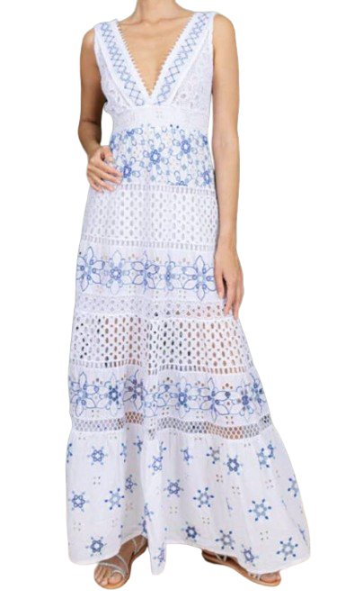 Temptation Positano Bestselling style. Long dress in pure cotton with contrasting embroidery and metallic trim. V-neck.. This unique and exclusive piece features special embroidery.