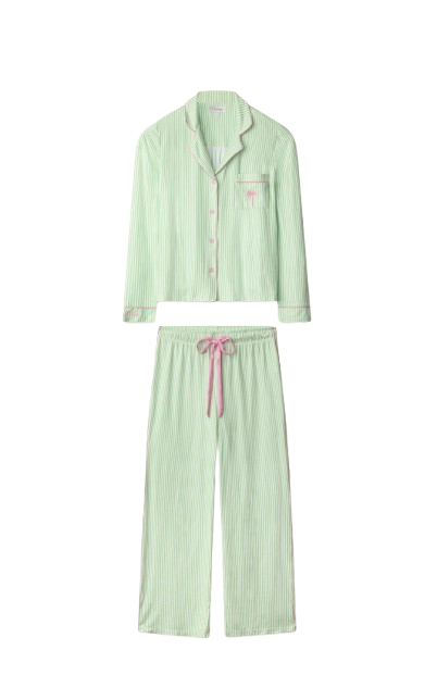 This green-and-white striped three-piece pajama set is fresh and feel-good, finished with cheerful embroidered details that add a subtle wink of charm. Crafted in butter-soft jersey, the button-front long sleeve top and easy drawstring pants are relaxed and comfortable, while the matching embroidered sleep mask completes the set with a thoughtful, fun-loving touch.