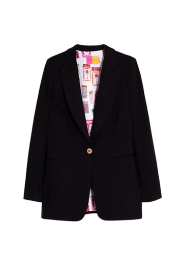Black blazer made of stretch-knit fabric with a straight cut and classic notch lapel. Features a front gold-tone button with a red heart design and three illustrated buttons on the cuffs. Two welt pockets at the front. Interior lining printed.