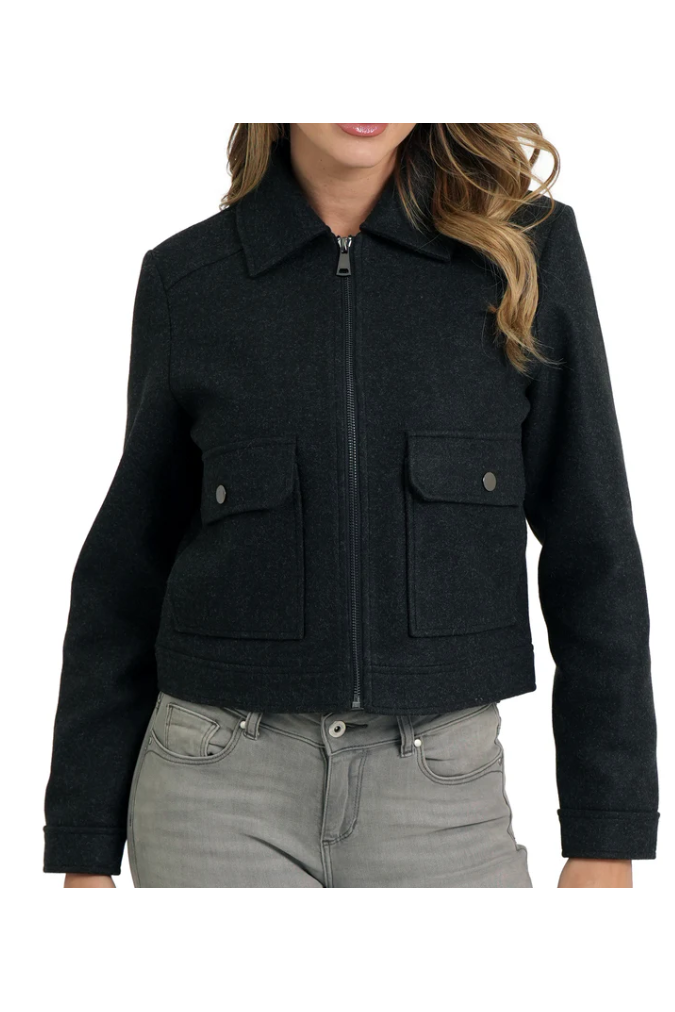 Zibby cropped jacket, spread collar, zip front closure, front flap pockets w/snap closure, back yoke, relaxed fit.