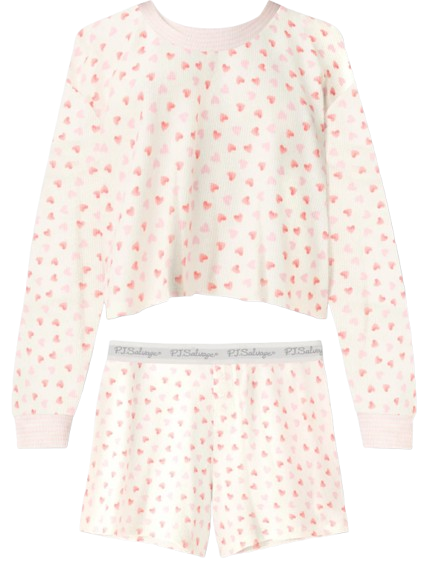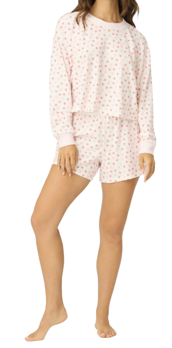 Sweet, soft, and made for lounging with love. This two-piece boxer set features a relaxed long-sleeve top and matching shorts in baby peachy waffle fabric. The ivory base is sprinkled with tiny pink hearts—the perfect playful touch for cozy mornings, self-care nights, and everything in between.