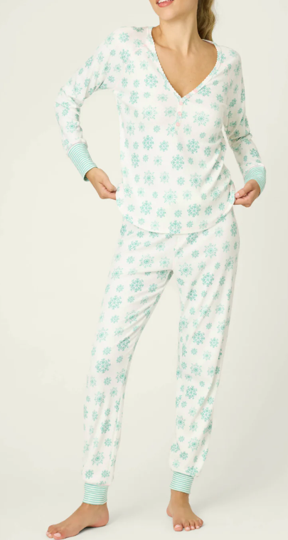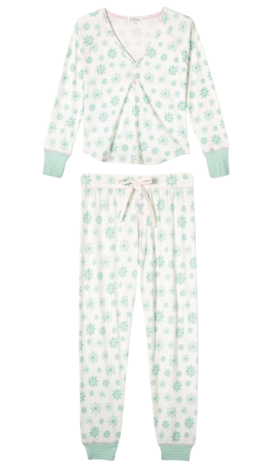 Women’s ivory pointelle pajama set with green snowflake print, V-neck henley long sleeve with striped cuffs, jogger pants with pink tie.