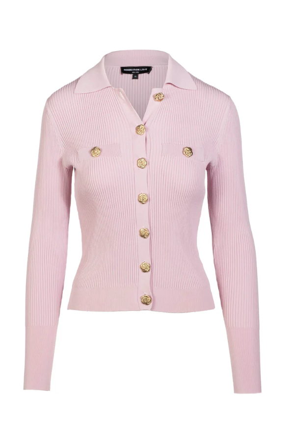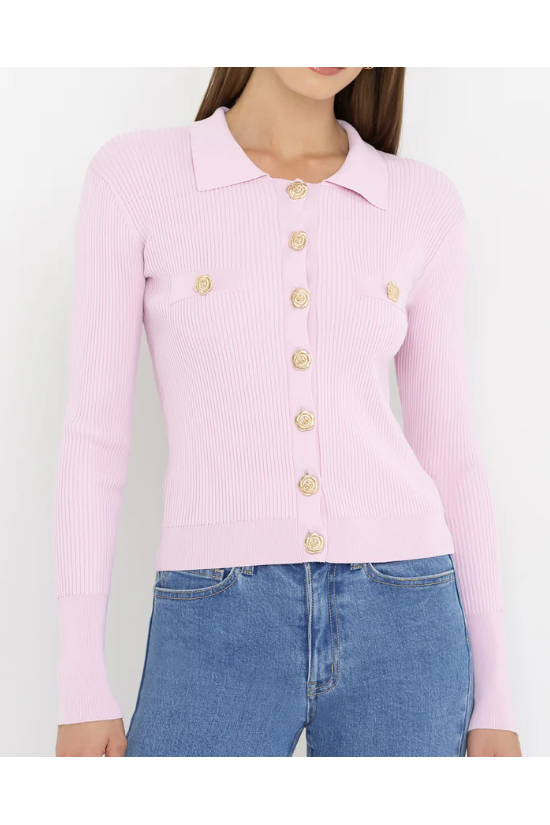 A stylish collar brings modern polish to this rib knit cardigan, while gold rose buttons add a distinctly feminine finish. Versatile enough for workdays or weekends, it's a standout essential for your fall wardrobe.