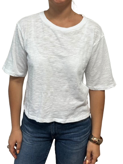 This crew neck tee is the perfect cropped easy tee. Designed with a boxy, boyfriend fit, center back seam, and a ribbed neckline, this tee is sure to become a staple.