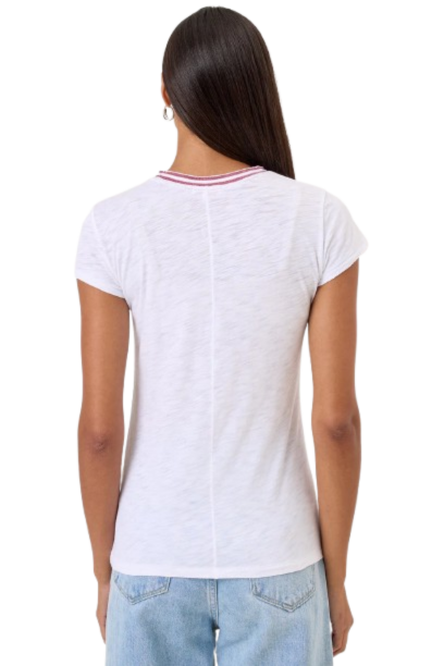 TWICE THE SPARKLE: FINISHED WITH A DUAL-TIPPED RINGER THAT SHIMMERS IN THE LIGHT, THIS FLATTERING TEE INVITES YOU TO SHINE ANYTIME. VERTICAL RAILROAD-STITCH SEAMING IN BACK COMPLETES THE LOOK.