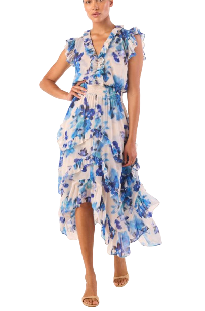 Chic and universally flattering, the best-selling Dakota is a playful yet polished midi dress designed for all seasons. Cut from blurred bouquet–printed chiffon, it features a buttoned V-neckline framed with soft ruffle trim and delicate ruffle accents at the shoulders. A smocked elastic waist defines the silhouette before flowing into a tiered skirt finished with ruffle detailing.