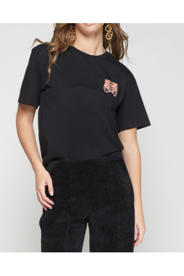 Black short-sleeved T-shirt with chest pocket featuring a beaded tiger embroidery in pink, orange and gold. Round neckline, 100% cotton, regular fit.