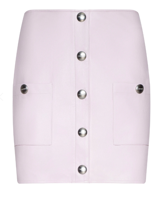 Bestselling mini skirt, now updated in icy lilac. Accent buttons and patch pockets exude modern prep while the subtle stretch vegan leather molds to the figure and hits mid thigh.